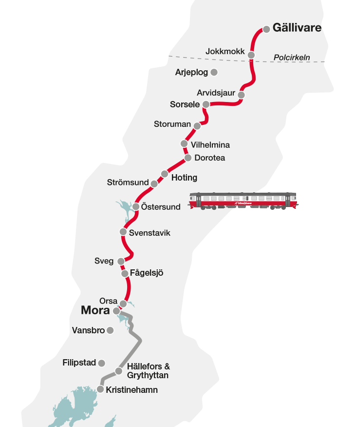 Inlandsbanan sträcker sig hela 130 mil genom Sverige från Kristinehamn i söder till Gällivare i norr.